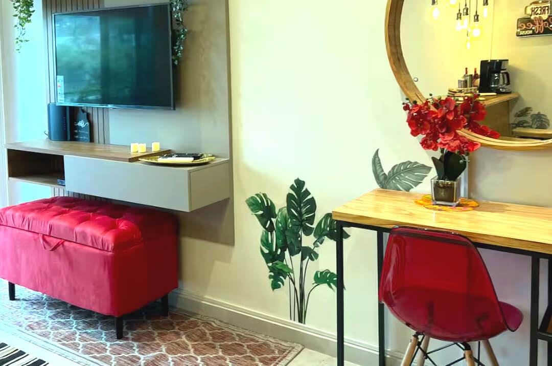 Perfect for couples or business travelers, this thoughtfully designed space includes air conditioning, a washer/dryer (rare in the area), microwave, hot and cold water filter, coffee maker, blender, fast Wi-Fi, smart TV with cable, a work desk, and a spacious balcony for morning coffee or evening relaxation.